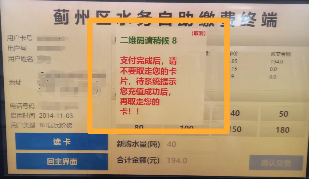 手機繳費完成后不要取卡,待系統(tǒng)提示成功后再取卡,如圖
